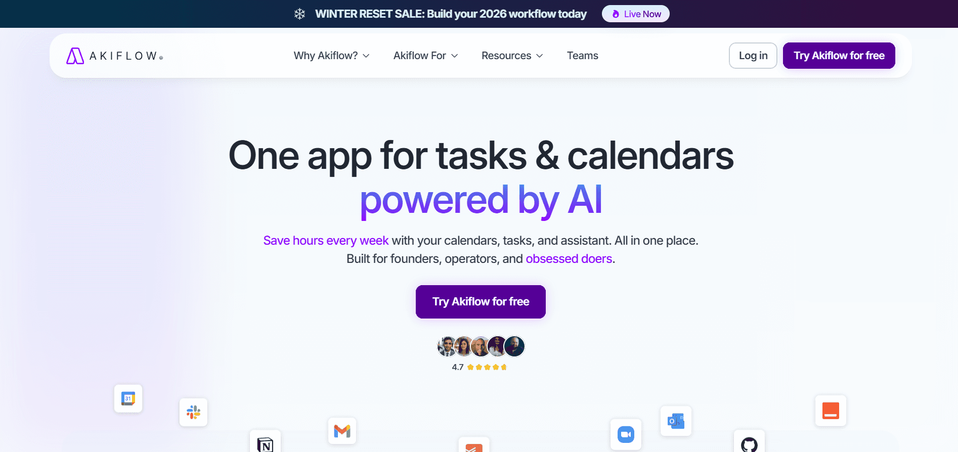 Akiflow combines task management and calendar scheduling into a single command center. It pulls tasks from tools like Gmail, Notion, Slack, and Asana, then helps you time-block your day with one click. Unlike tools that fully auto-plan your day, Akiflow keeps you in control while removing the friction of manual scheduling.