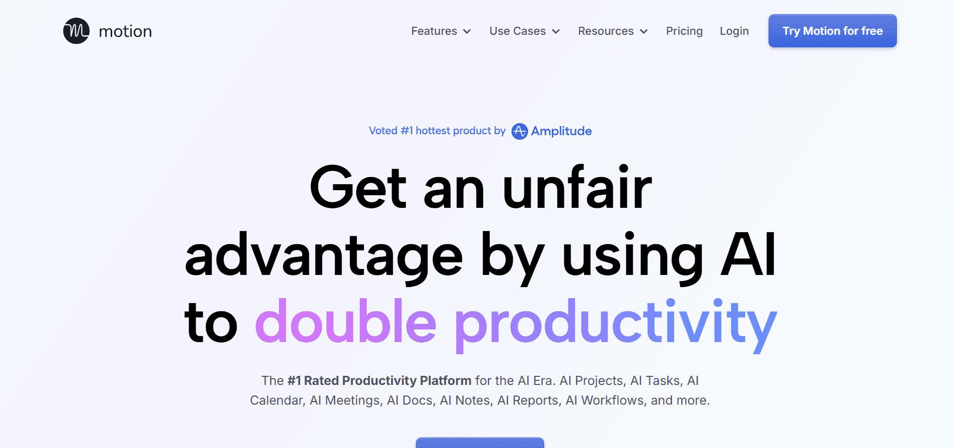 Motion turns your task list into a live, prioritized schedule. It automatically plans your day based on urgency, deadlines, and meeting times.