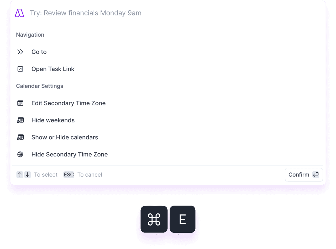 - From the Calendar: Click the + icon or long press to create tasks, events, and time slots. Use natural language to describe tasks (e.g., “Call John today at 3pm for 1 hour”).